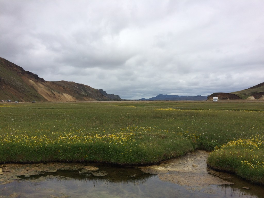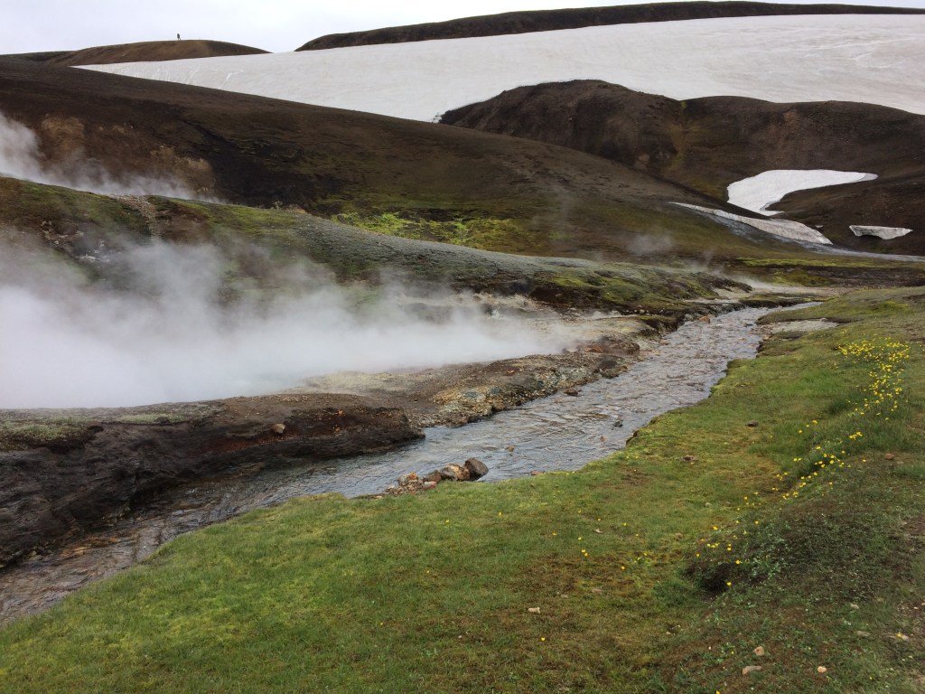 For the more hardy members of the group a swim is on the agenda in the nearby geothermal stream (a tributary of which is pictured below), whilst some of us resort to taking photos instead. The thought of taking off my comfy merino layers is too much even at this stage! However the presence of this stream is why this particular trailhead is also known as the hot springs route in Iceland (Laugavegurinn). The one blessing of the cool weather is that it has kept the midges at bay (allegedly there had been clouds of them the previous week at the trailhead when the sun was out).