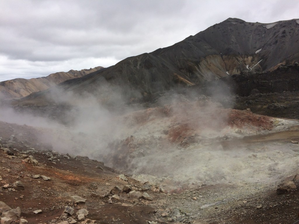 Off we set again and head up over yet another ridge and this is when the first of what will be a number of fumeroles is spotted. The only sounds (apart from us), are of the hot water and steam exiting the earth (hissing and bubbling) combined with the unique smell of sulphur. This all contributes to the different colours that are evident in the surrounding volcanic rock and sand (this is also dependent on what types of minerals are dissolved in the water). The sun however is still obscured by cloud! There are not many other people on the trail from this point onwards.