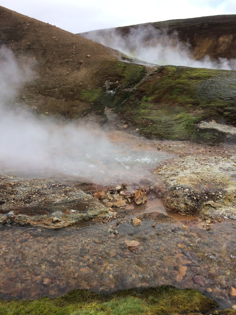 Further on we travel, and descend into another valley where there is some more volcanic activity alongside a river. On closer inspection one can see the hot water bubbling up through the rocky terrain, along with being able to hear the hissing of the steam. It is nice to be out of the wind and close to some warmth (but not too close!!!). The patches of alpine moss and lichens provide a stark contrast with their vivid colours.