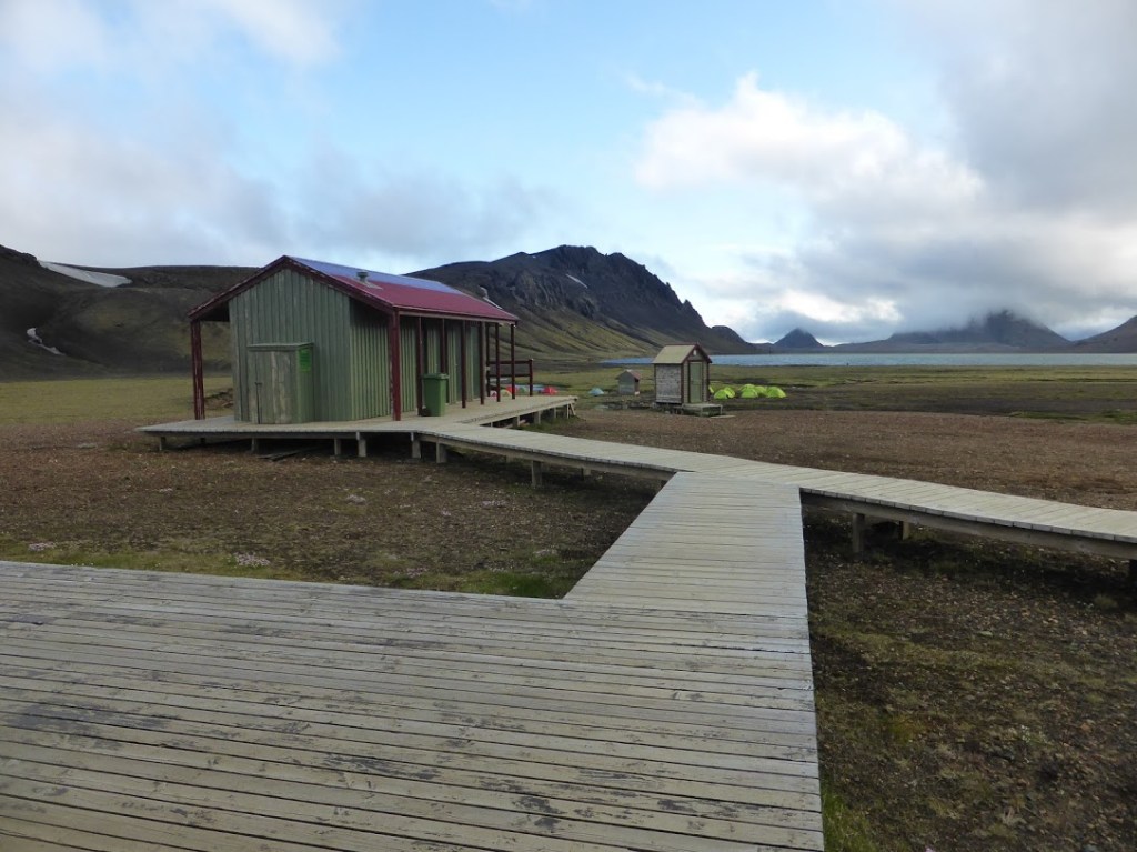 On we trek until we are wending our way across the flats to the Alftavatn hut. Again boots and damp clothes are placed in the appropriate places. The hut is nice and warm courtesy of a gas powered heater (and the trusty support team who have arrived in advance). I head out to the sinks at the rear of the latrine/shower block (pictured below) to clean muddy equipment. The wind is still blowing but there is a hint of blue sky!!! The more hardy members of the group opt for a 5 minute shower despite having to brave the elements before and after.