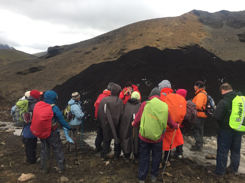Eventually we reach the slopes of Jokultungur. Then there is a descent down the side of this mountain, which is challenging as it is predominantly on loose shale rock. Two thirds down the slope my thighs are burning (from the lactic acid build up and mild dehydration), but there is no stopping. I slip on one occasion but do not tumble (the hiking poles are invaluable on this terrain). We all keep close together (for safety), which becomes a lot easier as we descend below the cloud line.
