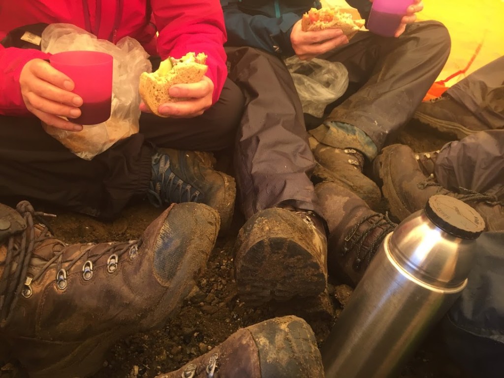 Despite the cramped conditions it is warm and out come the sandwiches and coffee. One of my fellow trekkers snaps a photo of our muddy boots (I am to the right holding a pink plastic cup-with the obligatory coffee in it!!!).