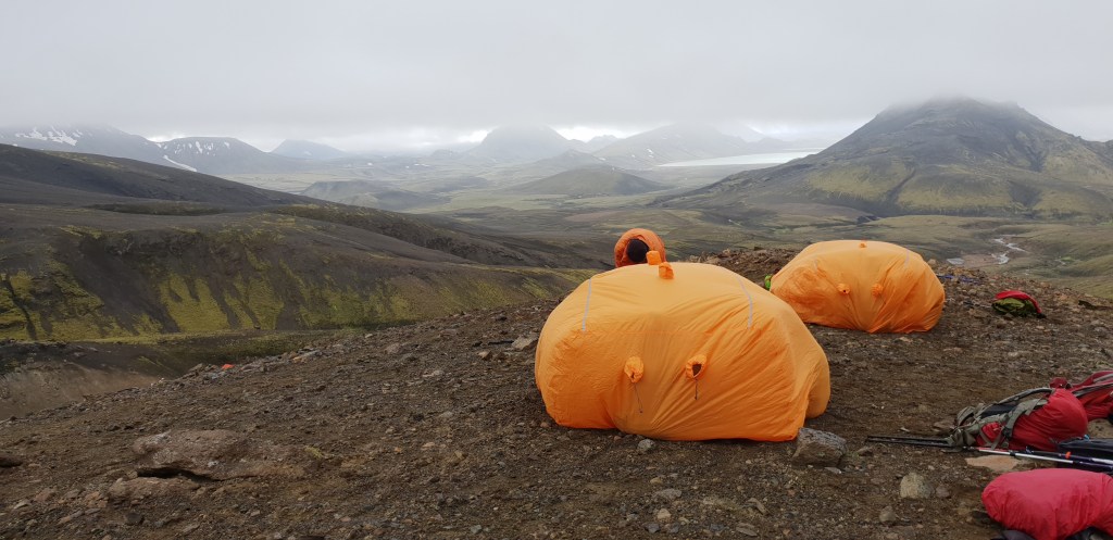 Then all of a sudden Solvi produces two bright orange oval tarpaulins and we split into two groups. With some gymnastics and preplacing of sandwiches and coffee thermoses on the ground the next thing we know is that most of us are now inside two temporary shelters on a promontory. In the distance is our final destination (Lake Alftavatn and the surrounding mountains). It is a relief to be out of the wind.