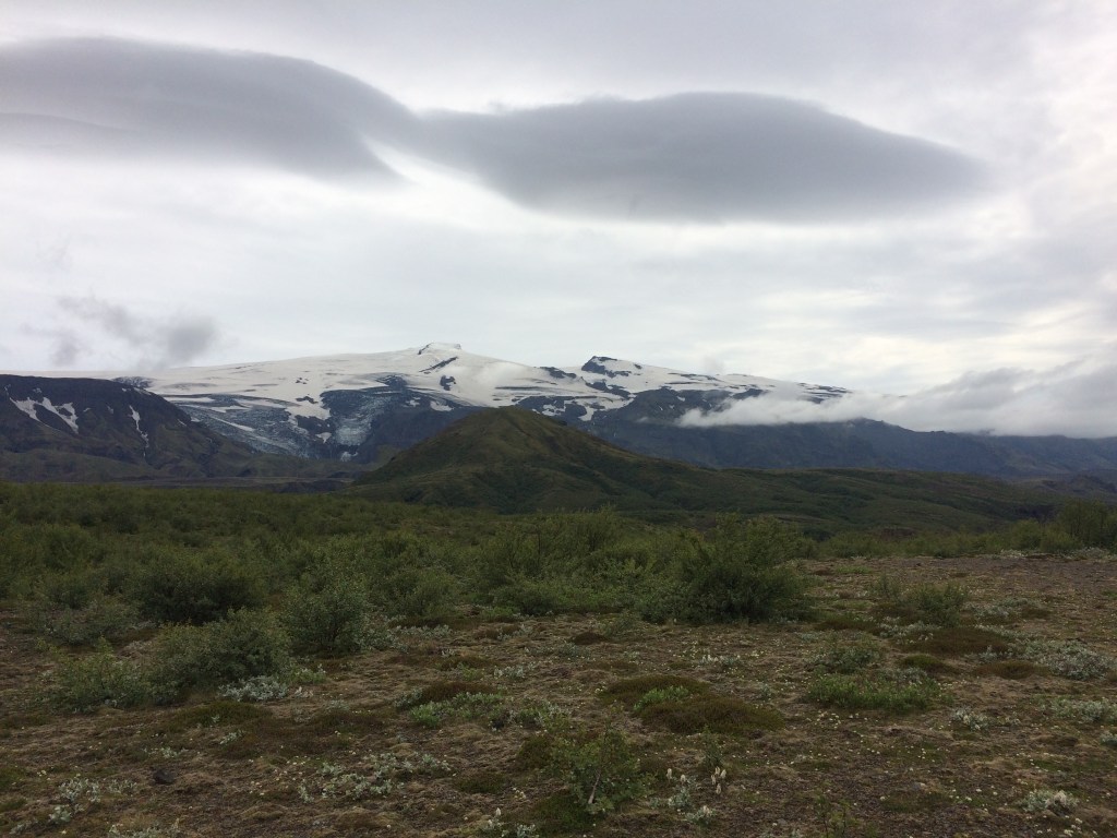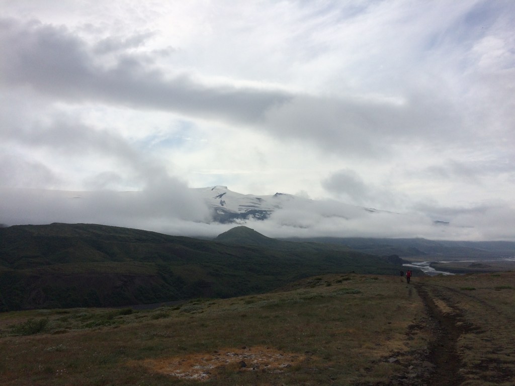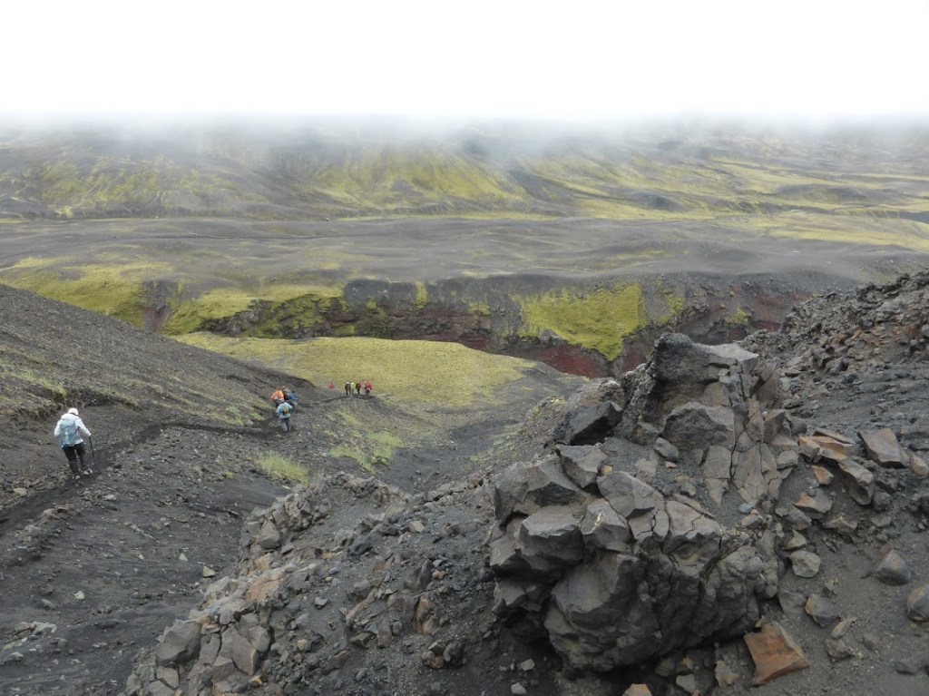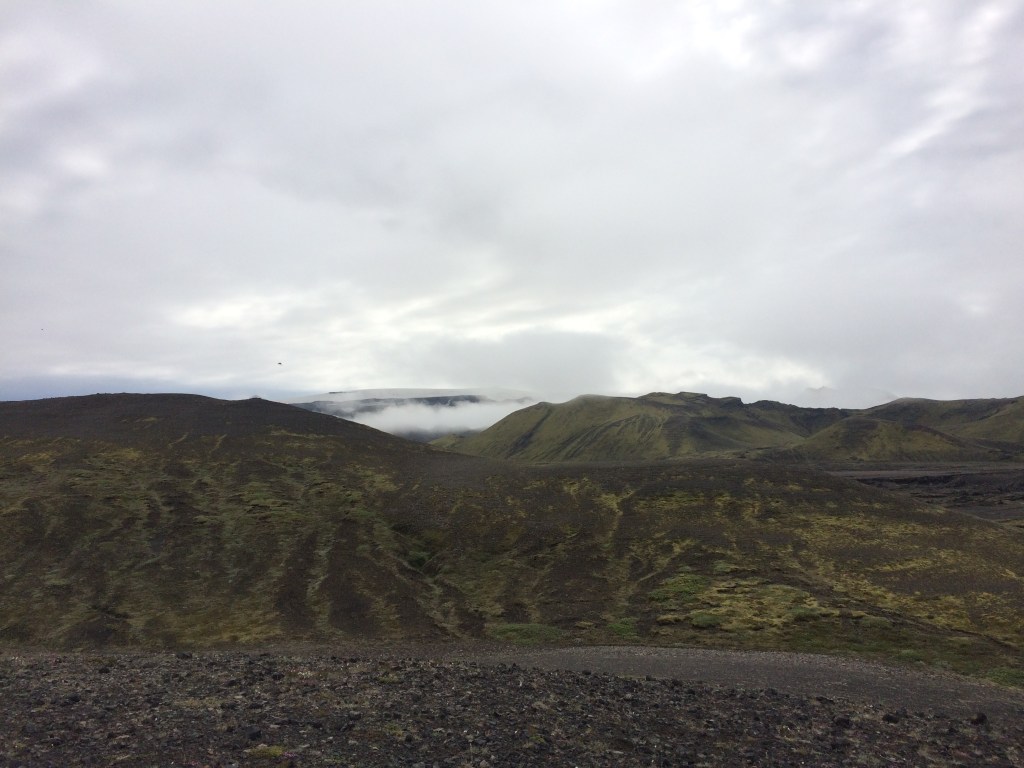 The low cloud cover has limited our views of the summits of the nearby mountains but then as the cloud lifts (and we begin to descend again), there is a brief glimpse of the Myrdalsjokull glacier, as the Laugavegur trail runs in parallel to the west of it for this particular segment. There are now some better views to be had of the nearby hills which are covered in moss and lichen. Hence the green!