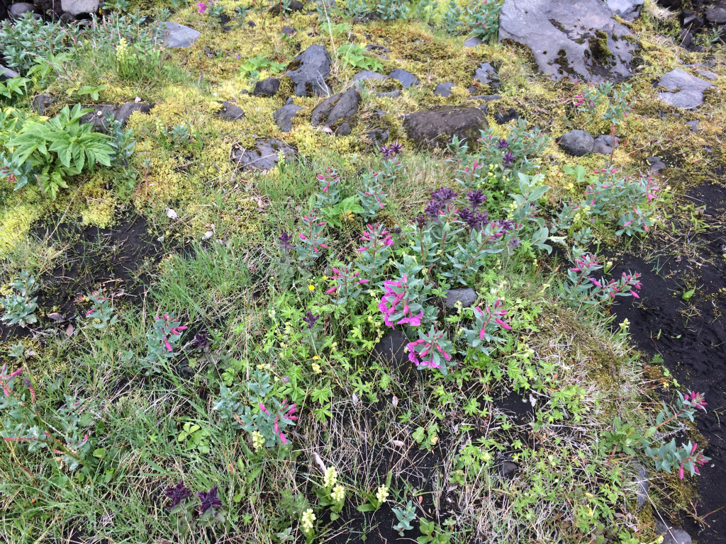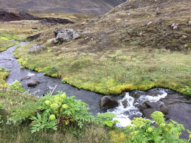 Further on we trek over another ridge and lo and behold there is a small stream with some vegetation around it (not just the usual moss and lichen). This is an opportunity to have a short stop and for everyone to regroup before the next hill climb! For the photographers there is the opportunity for some macro shots of the unusual vegetation (plus we are out of the wind). The large light green bushes with flower heads on them are Angelica.