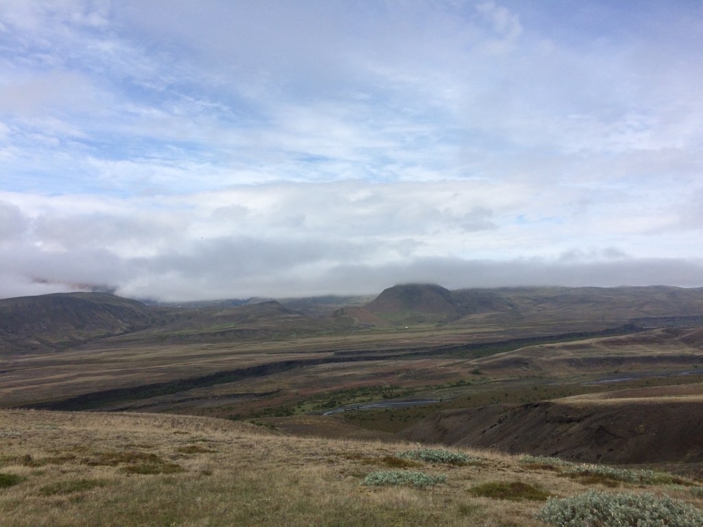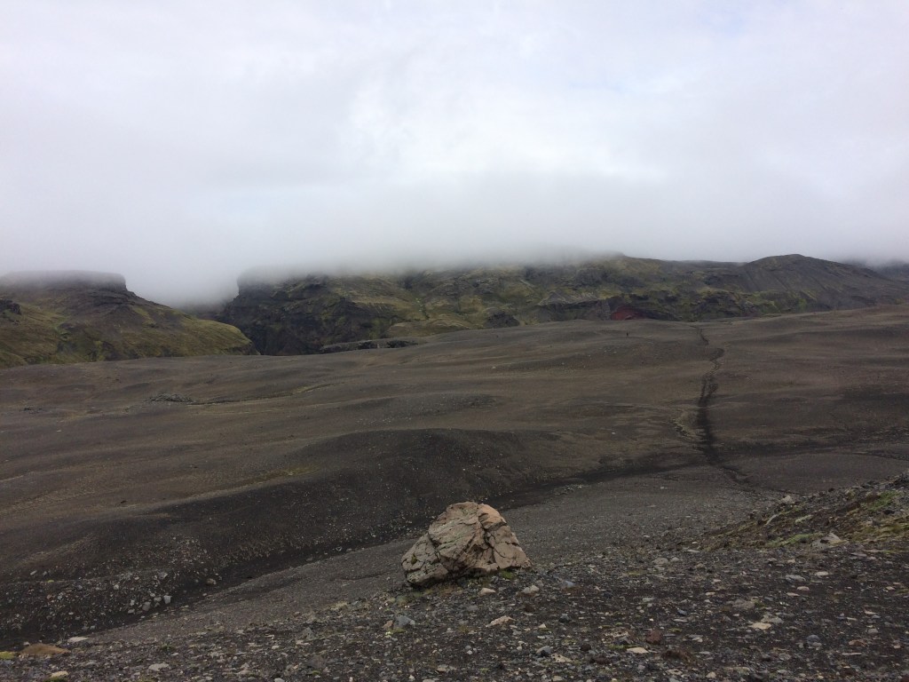 Crossing the Fremri-Emstrua river is straight forward as it is via a bridge and we then walk alongside it before we head up again across more volcanic sand and rock. The cloud ceiling remains low and we seem to be just beneath it at times.