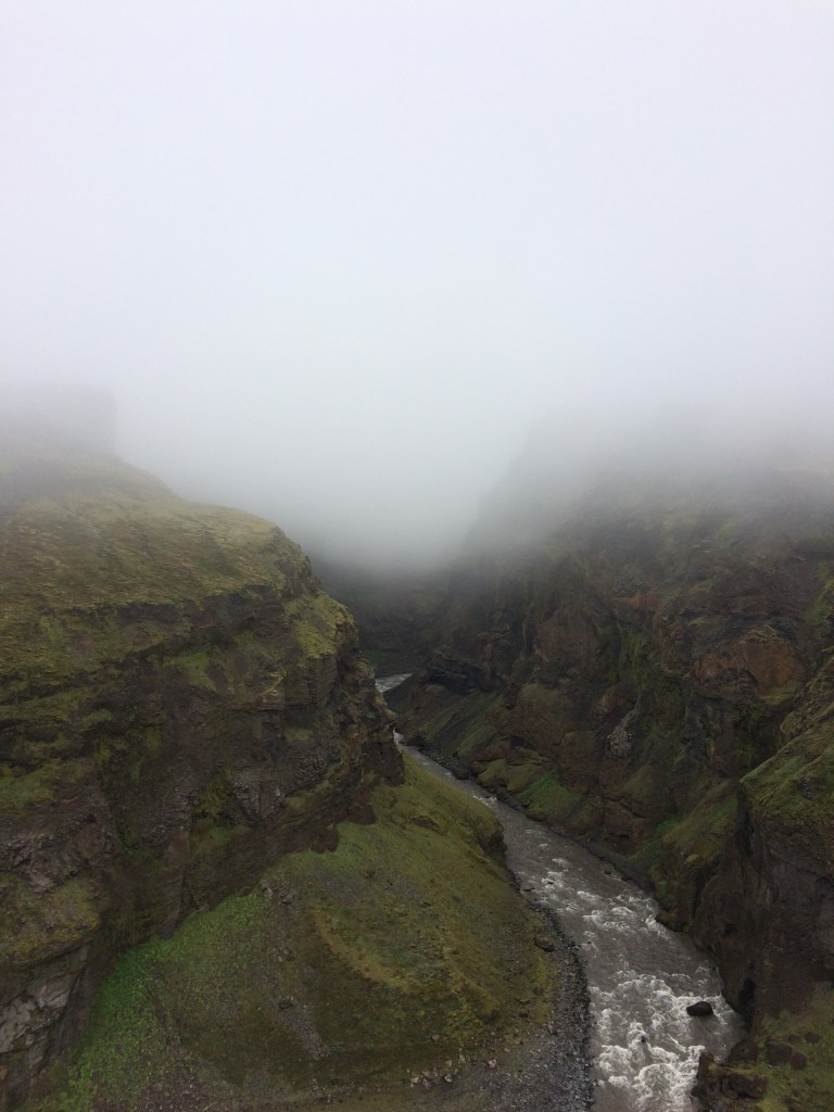 Off we set across black volcanic sand until we descend towards a nearby gorge with the Fremri-Emstrua river at its base. The tops of all of the mountains remain obscured at this stage. There are chains that you can hold onto on this part of the trail (an added safety measure for the trickier parts which are on uneven rock). You do not want to slip!