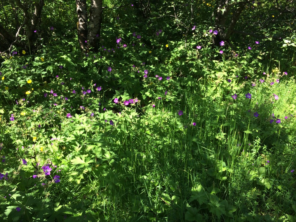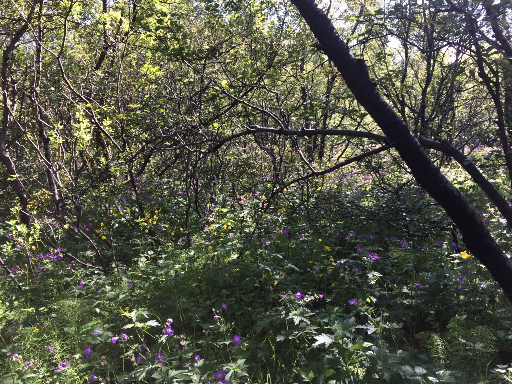 Mercifully we do not need to repeat our mornings journey up and over Mount Valahnuker but instead we follow a trail though the forested region of Porsmork back to Langidalur. By this stage the sun has come out so the outer gear can be discarded. The colours of the flowers along with the vibrant undergrowth are really brought out by the added light. What is not captured by the photos are the sounds made by the numerous small birds who have made this region their home during summer.