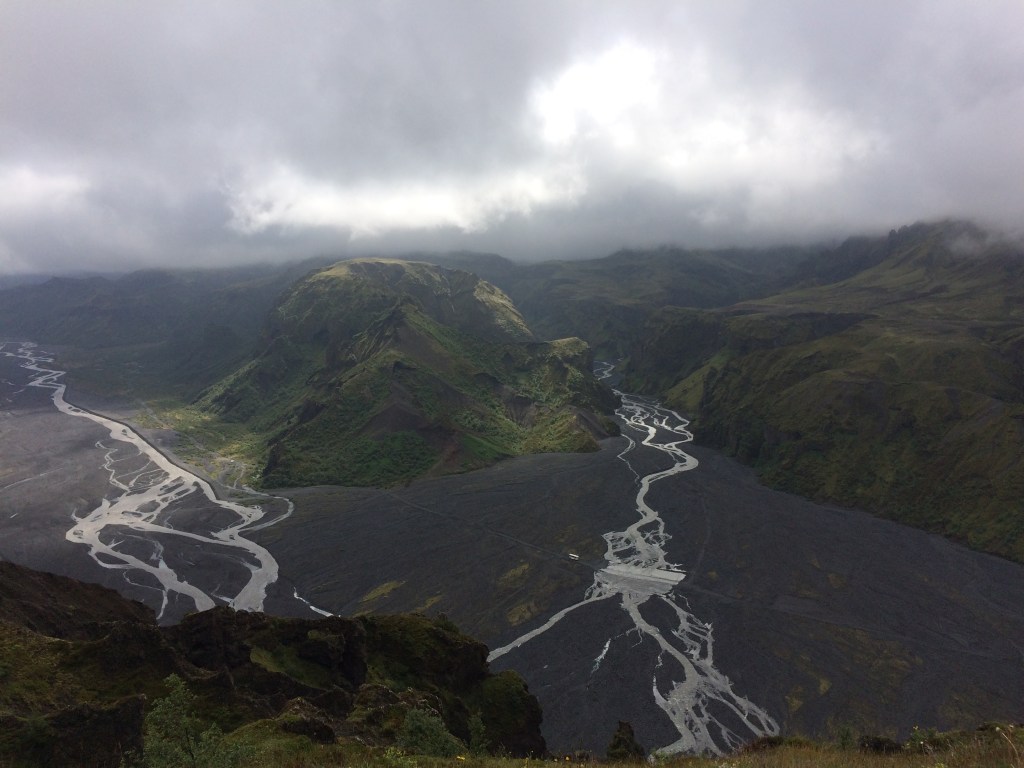 Onwards and upwards we head until we are at the top of Mount Valahnuker. The hoped for views of the nearby glaciers are nixed by the cloud cover, but the views of the nearby valleys with the glacier fed rivers are worth it. Below on the left had side is the Krossa river, in which 4 wheel drive vehicles get trapped weekly during the summer, usually when inexperienced drivers take risks! Solvi has stories to tell about these types of vehicle mishaps as well. Hint, they are very expensive if you are the driver.