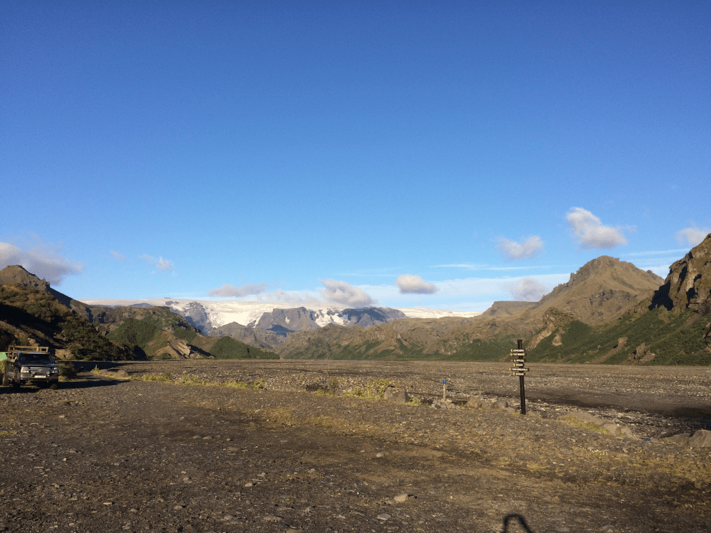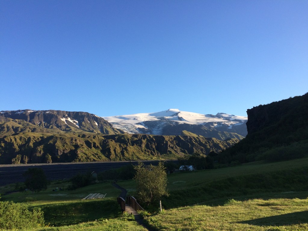 As the light is so good I also take the opportunity to snap a photo of the Myrdalsjokull glacier at the head of the nearby valley. Such lovely bright blue sky! All the time I am hoping that the weather will be like this tomorrow. The first part of the Fimmvorouhals trek will take us along this valley towards the trail head in the direction of the glacier.