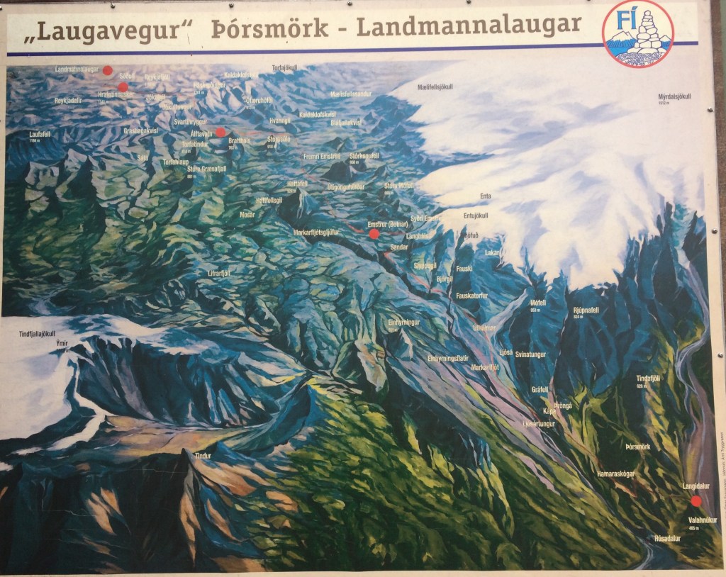 I revisit the previous 4 days spent on the Laugavegur trail as it is well depicted on one of the signs outside of the main hut, as pictured below. I can visualise all of the mountain peaks that I trekked by (some of which were not visible at the time). Breakfast is the usual porridge and strong coffee along with bread and butter. As we will only head off for 3-4 hours of trekking today there is no need to pack a lunch.