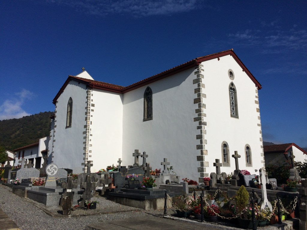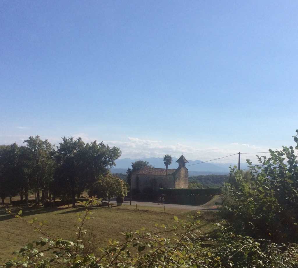 Again every hill afforded a view of the Pyrenees and sometimes something else. I had to be careful taking the photo below of an historic church because I was standing by a road and yes I had to watch out for those cars! This was just prior to the last push for the day up the final hill into Arthez de Bearn.